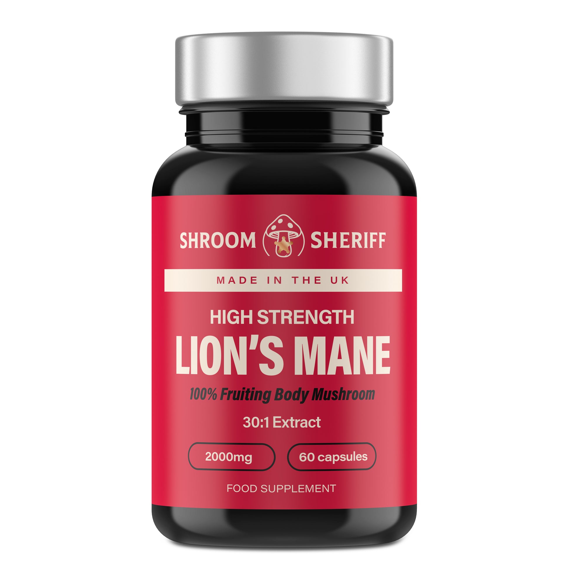 Shroom Sheriff Lions Mane Supplement capsules contain a potent 2000mg dose derived exclusively from the fruiting bodies of the mushroom, providing twice the strength of typical formulations. This supplement supports brain health for focus, memory, and mental stamina across all age groups. Regular use may help maintain cognitive function and protect against age-related decline, promoting long-term brain wellness. Ideal for those seeking to boost mental clarity and reduce fatigue naturally.